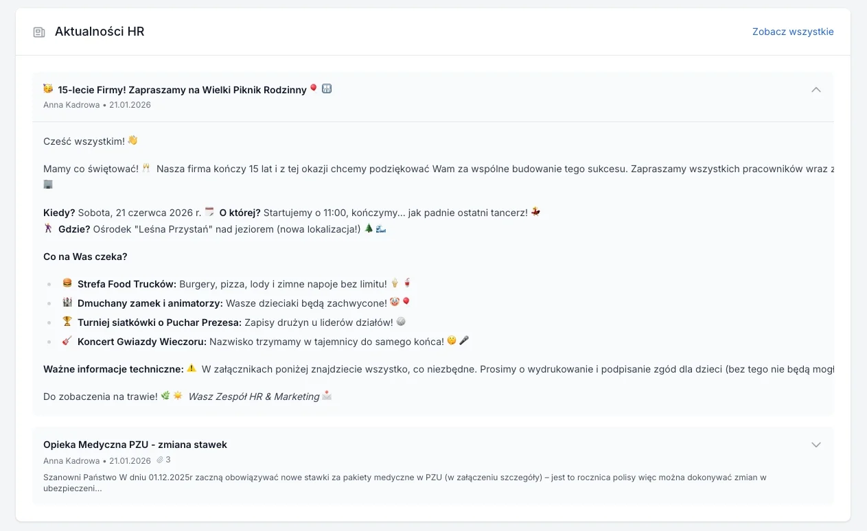 Centralne miejsce dla komunikacji wewnętrznej. HR publikuje ważne ogłoszenia, informacje o programach benefitowych, zmianach w regulaminach czy wydarzeniach firmowych. Wszystko w jednym miejscu, dostępne z dashboardu pracownika.