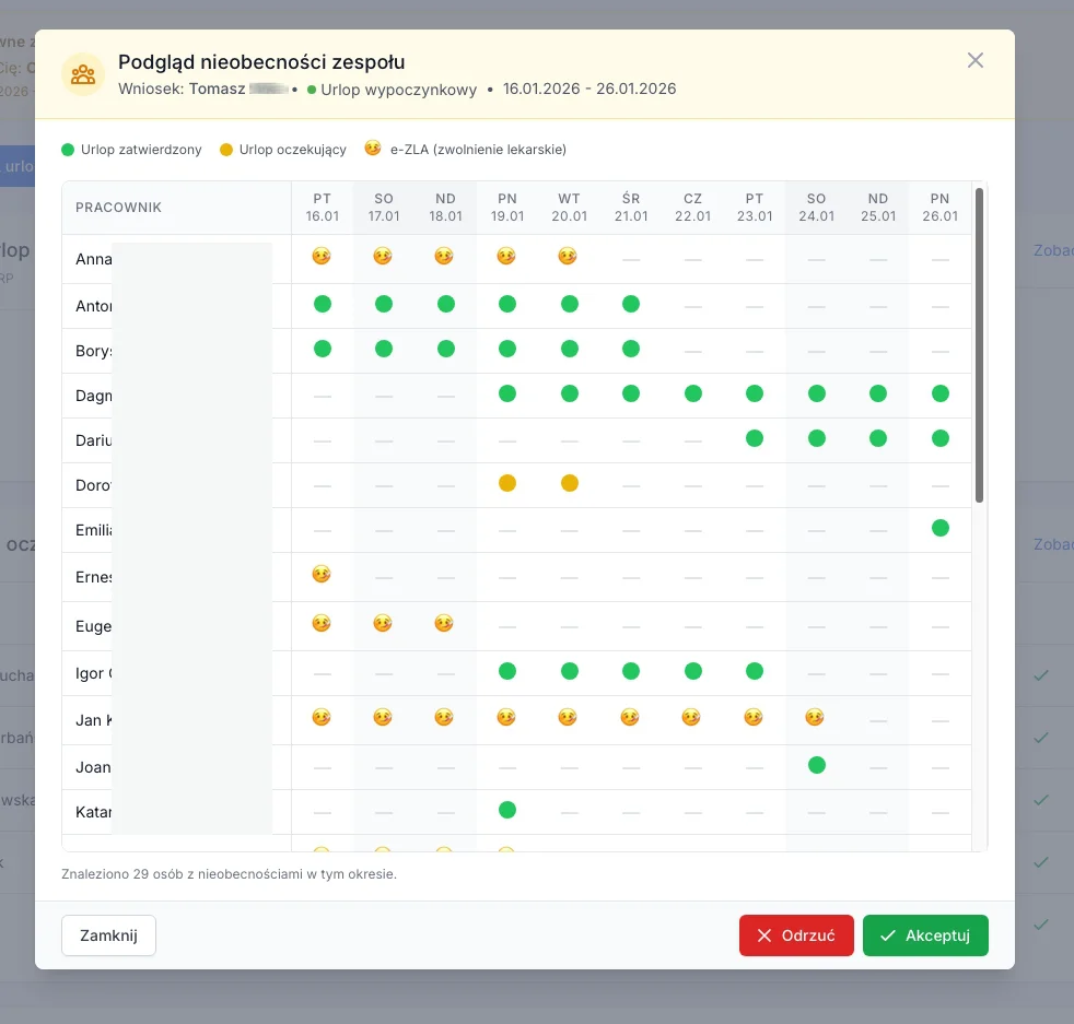 Przy akceptacji wniosku manager widzi, kto z zespołu jest już nieobecny w tym samym czasie. Pomaga unikać sytuacji, gdy zbyt wiele osób jest na urlopie jednocześnie.