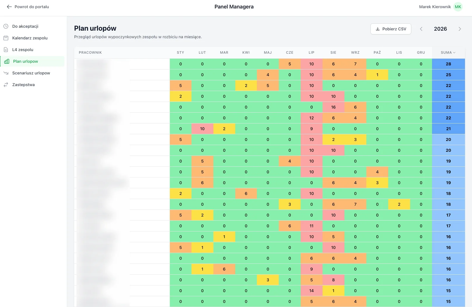 Roczna matryca urlopów zespołu z wizualną heatmapą. Szybki przegląd planowanych nieobecności i identyfikacja krytycznych okresów. Widok 12 miesięcy na jednym ekranie.