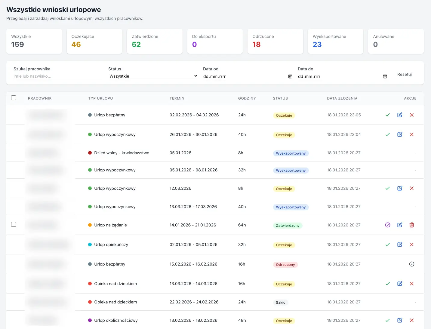 Dodatkowa warstwa weryfikacji dla HR. Przejrzyj i potwierdź wszystkie zatwierdzone wnioski zanim trafią do systemu płacowego. Wykrywa konflikty z e-ZLA i pozwala na ostateczne korekty.