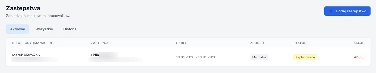 Unikalny system delegowania uprawnień. Gdy manager składa wniosek urlopowy, automatycznie wyznacza zastępcę, który przejmuje akceptację wniosków. Działa też dla ręcznych zastępstw (np. choroba).